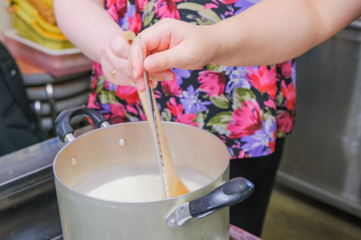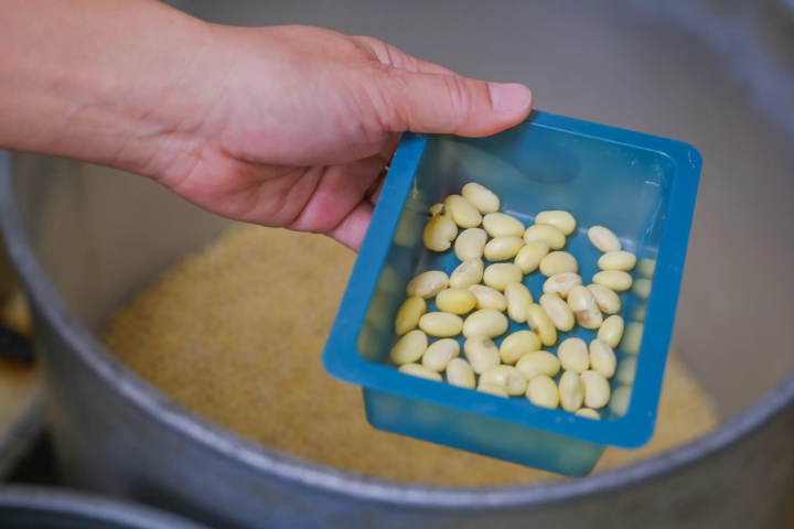 จากนั้นจะค่อย ๆ คนผสมกับน้ำนมถั่วเหลือง พร้อมทั้งค่อย ๆ เพิ่มอุณหภูมิ เมื่ออุณหภูมิถึง 80 องศาเซลเซียส จะเติม 「นิงาริ」 ลงไป แล้วเต้าหู้จะเริ่มแข็งตัวอย่างช้า ๆ ช่วงเวลารอคอยนี้เองคือเสน่ห์ของประสบการณ์ทำเต้าหู้ด้วยตัวเอง
